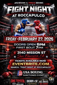 SAN FRANCISCO, CA (February 25, 2026) — San Francisco’s premier boxing promoter Coach Art, alongside a major force in Northern California amateur boxing, Coach Robert Fernandez of 415 Boxing, are bringing it back. On Friday, February 27, 2026, 415 Boxing and Frisco Boxing present “Fight Night at Roccapulco”, a USA Boxing sanctioned amateur boxing event in the heart of the Mission District. This event represents the continuation of more than two decades of active involvement in San Francisco’s boxing community, not a new venture, but a proven tradition.