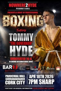 CORK, Ireland (March 23, 2025) – International road warrior boxer Tommy “The Governor” Hyde (14-0, 9 KOs) returns home to fight there for only the fourth time as a professional, headlining a show presented by NoWhere2Hyde Promotions, on April 18 at The Parochial Hall in Gurranabraher, Cork, Ireland.