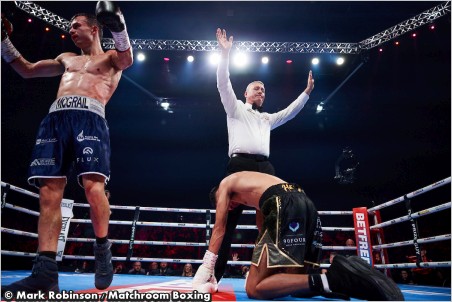 ARTHUR disposes of KIRK IN 113 seconds. Arthur was looking to get this one over quickly and used strong right jabs to forced Kirk to the ropes unloading on him with straight rights and hooks from both hands. Kirk escaped but was driven across the ring and dropped to his haunches and then to his hands and knees and was counted out. All over in 61 seconds. The 24-year-old Arthur is the son of Alex Snr the former European, Commonwealth, British and WBO interim champion.