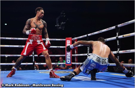 GILLEY wins the vacant WBA International title with a stoppage of Glasgow’s BROWN. The first three rounds of this one were close. Brown was putting Gilley under pressure piling forward behind his jabs and firing shots to the body. Gilley handled the pressure well sliding away and connecting with hard counters and looked to be edging the rounds. Brown continued to come forward in the fourth but Gilley was picking him off with hard rights. Brown was a rocked by a right to the head and a left to the body in the fifth and dropped to one knee. He climbed to his feet but his right eye was almost closed and as he staggered under punches from Gilley the referee halted the fight. Former Commonwealth champion Gilley was rebounding from a close points loss to Ishmael Davis in November. Brown pushed hard but Gilley’s power was too much for him.