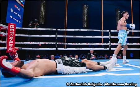 CHAVES flattens MADUENO in the third. Impressive first showing in the USA for Chaves. The Argentinian was quickly on target with his right jabs and was driving straight lefts to Madueno’s body. Those lefts to the body and some quick combinations continued to get through in the second with Madueno very much on the defensive. Chaves walked Madueno down in the third shadowing him around the ring. Chaves ended it in spectacular fashion. When Madueno took a step away from the ropes Chaves connected with a thunderous left to the head that sent Maderno down flat on his back out cold and he was counted out. Chaves, 25, has now won 15 of his last 16 fights inside the distance with Freddy Fonseca and Pablo Vicente both finished early. He is No 2 with the WBO and looks a real danger man. Mexican Madueno had scored 28 of his 31 wins by KO/TKO but was coming off back-to-back losses against Keyshawn Davis and Oscar Duarte.