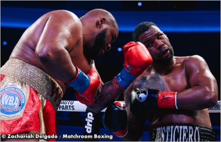 MILLER wins WBA eliminator with a unanimous decision mover PERO. Cuban Pero made the better start moving around a slow Miller who just prodded out his jab without following it up. Pero had faster hands and he got through with jabs and rights. Miller was a bit more active in the second but again the quicker Pero did the scoring. From the third Miller began to bully Pero shouldering him to the ropes and working inside. Miller was 50 lbs heavier and he used that weight to lean on Pero smothering Pero’s work and tiring him. That set the tone for the rest of the fight. Miller actually worked hard keeping up a high punch ratio in most rounds The movement Pero had shown in the first two rounds disappeared and he spent much of the fight with his back against the ropes. It was a gruelling brawl with the weighty clubbing shots from Miller wearing Pero down. Even when Pero escaped from the ropes he showed no real fire and pretty soon found himself back there again. It looked as though Miller might end it in the eighth as he had Pero in a corner and unloaded on him with heavy rights and lefts but Pero survived but was on unsteady at the end of ninth. Miller continued to bang away at Pero in the tenth but the Cuban rallied briefly in the eleventh landing some hefty body punches but Miller bossed the last. Miller won on scores of 117-111 twice and 115-113. This is only Miller’s second fight in almost two years and he indicated he wanted to fight again soon. Deontay Wilder’s name was being bandied about and that might sell well. Pero was a disappointment . Obviously giving away 50 lbs + was a handicap but to be exhausted after less than nine minutes was ridiculous.